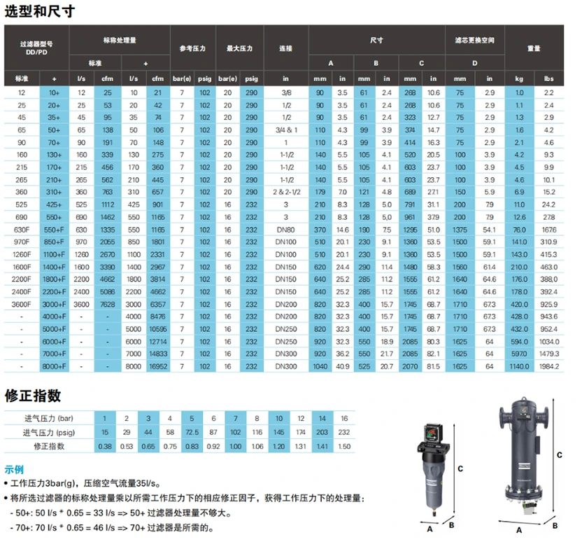 ဤဇယားသည် compressed air filter များနှင့် အထူးအပလီကေးရှင်းအချို့အကြောင်း အချက်အလက်များကို ပေးပါသည်။ |