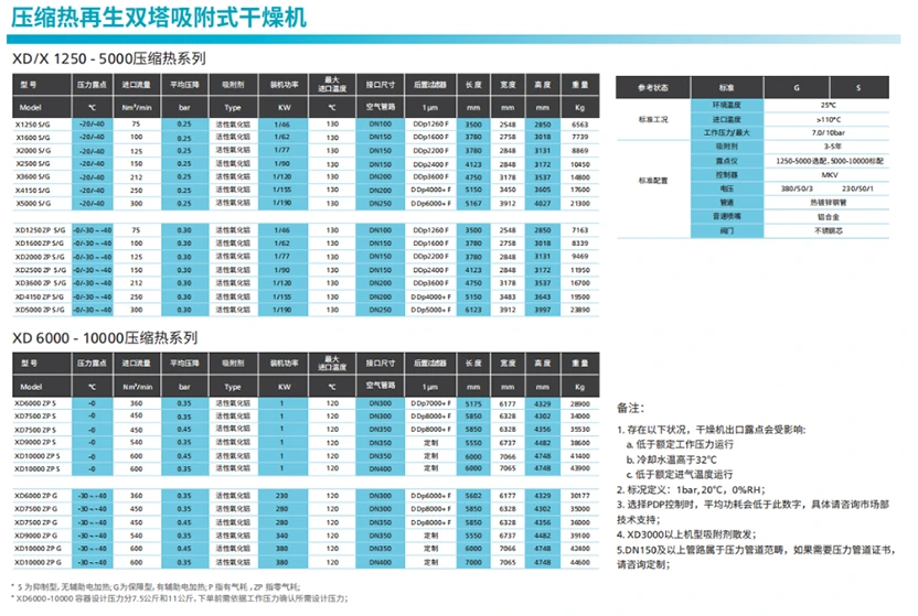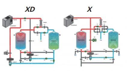 XD သို့မဟုတ် X compression heat adsorption dryers များသည် အရည်အသွေးမြင့် adsorbents များကို အသုံးပြုပြီး စုပ်ယူမှုကို ပြန်လည်ထုတ်ပေးရန်အတွက် oil-free compressor မှ compression အပူကို ထိရောက်စွာအသုံးချကာ စွမ်းအင်သုံးစွဲမှုနှင့် ပြုပြင်ထိန်းသိမ်းမှုကုန်ကျစရိတ်များကို သိသိသာသာလျှော့ချပေးသည်။