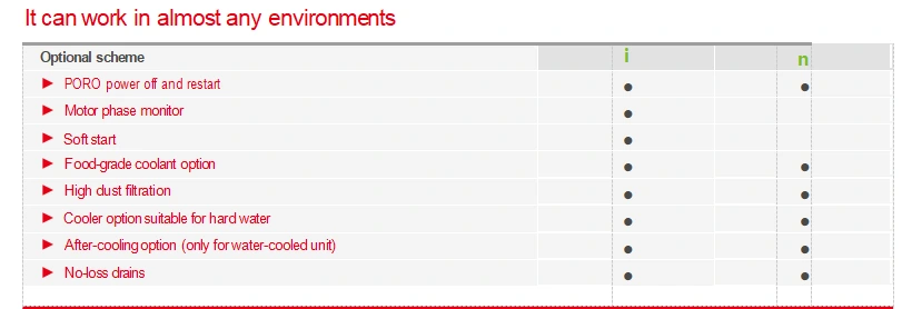 ကျွန်ုပ်တို့၏ကွန်ပရက်ဆာများသည် အစားအစာအဆင့်အအေးခံပစ္စည်းများ၊ မြင့်မားသောဖုန်မှုန့်စစ်ထုတ်မှုနှင့် ရေအေးအအေးပေးစက်များနှင့် သင့်လျှောက်လွှာလိုအပ်ချက်များစွာကို ဖြည့်ဆည်းပေးနိုင်သည့် ကြမ်းတမ်းသောပတ်ဝန်းကျင်နှင့် လိုက်လျောညီထွေဖြစ်အောင် အခြားရွေးချယ်စရာများကို ပေးဆောင်ပါသည်။