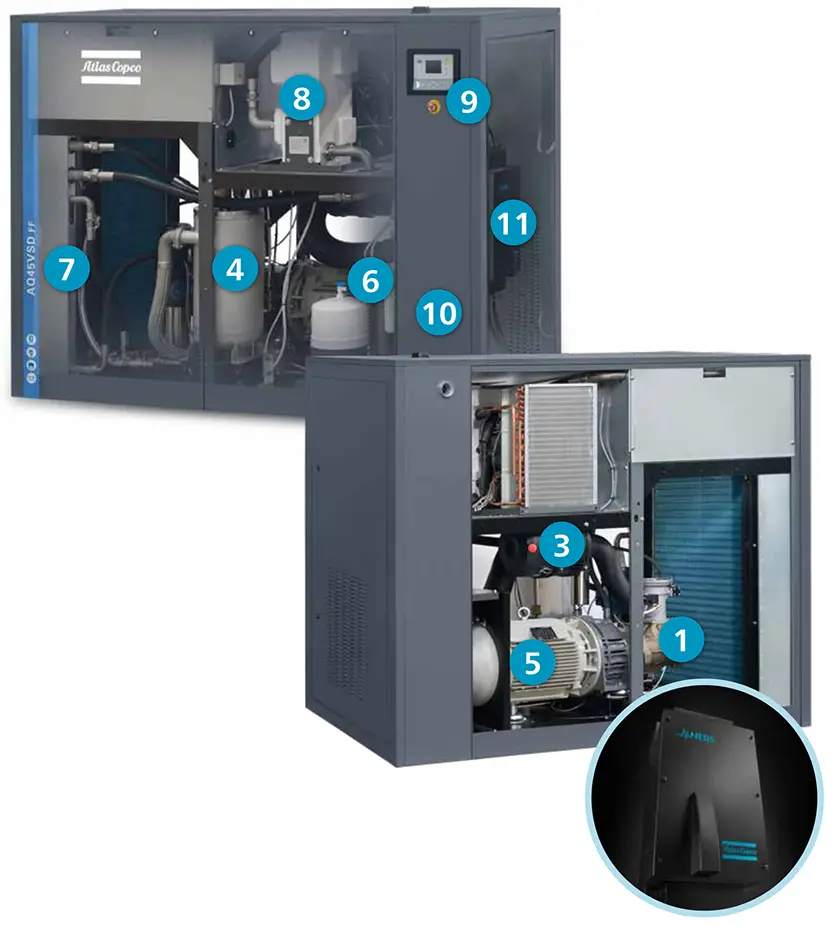 Atlas Copco ၏ AQ VSD နည်းပညာသည် သုံးစွဲသူများ၏ ဓာတ်ငွေ့အသုံးပြုမှု အပြောင်းအလဲများကို ခြေရာခံပြီး ကွန်ပရက်ဆာအမြန်နှုန်းများကို အချိန်နှင့်တပြေးညီ ချိန်ညှိပေးကာ ပျမ်းမျှစွမ်းအင် 35 ရာခိုင်နှုန်းအထိ ချွေတာနိုင်ပြီး စုစုပေါင်း ဘဝလည်ပတ်မှုကုန်ကျစရိတ် ခန့်မှန်းခြေ 22 ရာခိုင်နှုန်းအထိ သက်သာစေပါသည်။
